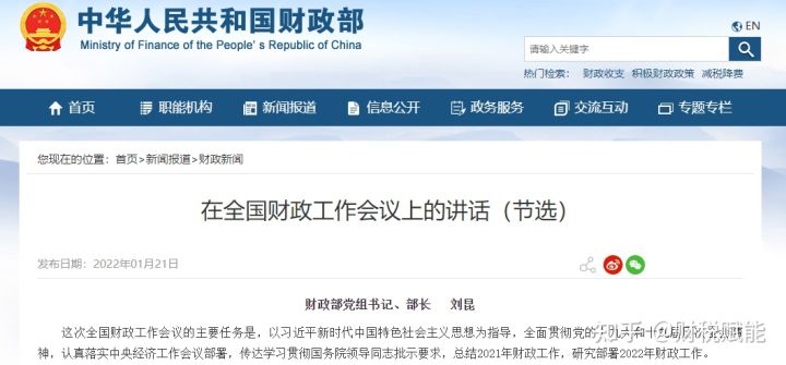 2022年1月21日,財政部黨組書記、部長劉昆在全國財政工作會議上的講話: